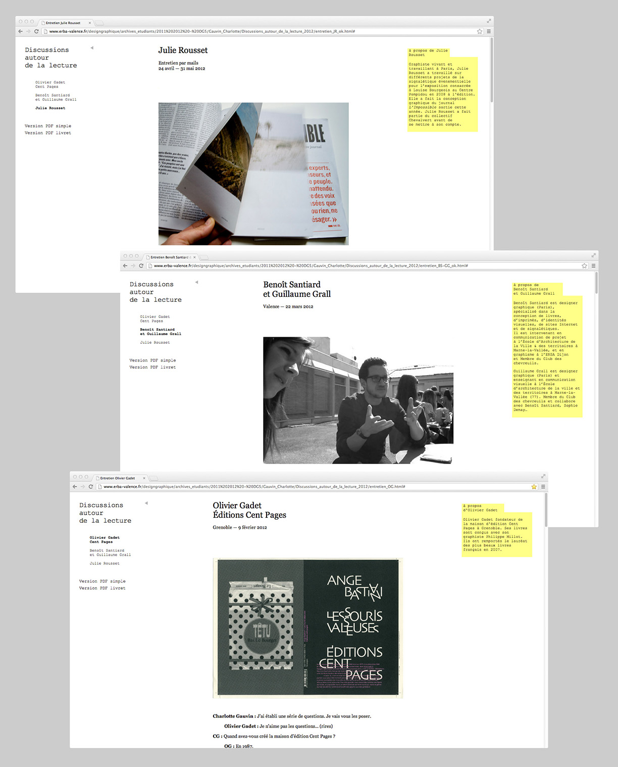 Série d’entretiens menés dans le cadre de mon projet de DNSEP avec l’intention de questionner les relations entre le design d’un texte et sa lecture. J’ai choisi de rencontrer Olivier Gadet des Éditions Cent Pages, Benoît Santiard & Guillaume Grall du studio de design graphique Building Paris et Julie Rousset, graphiste indépendante. Pour la restitution de ces échanges, j’ai conçu une interface web de consultation des entretiens, avec leur version imprimable en PDF format A5 en page simple ou en livret.